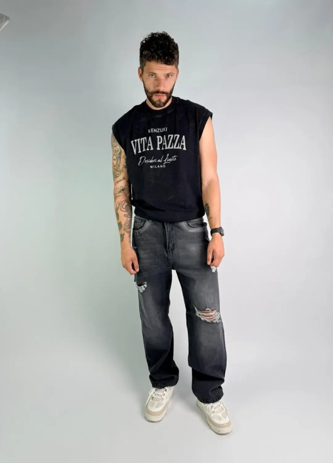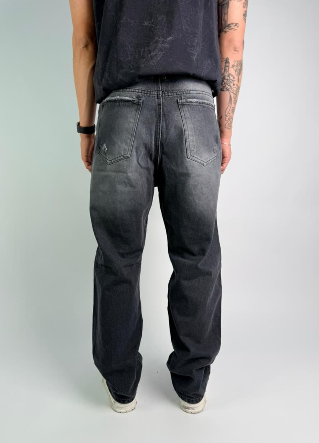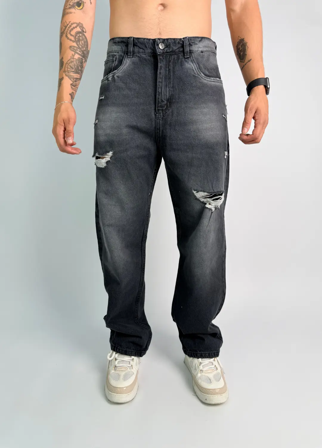 Con su silueta amplia, desgaste y rotos en un lavado gris oscuro; este jean es refleja un estilo determinante.